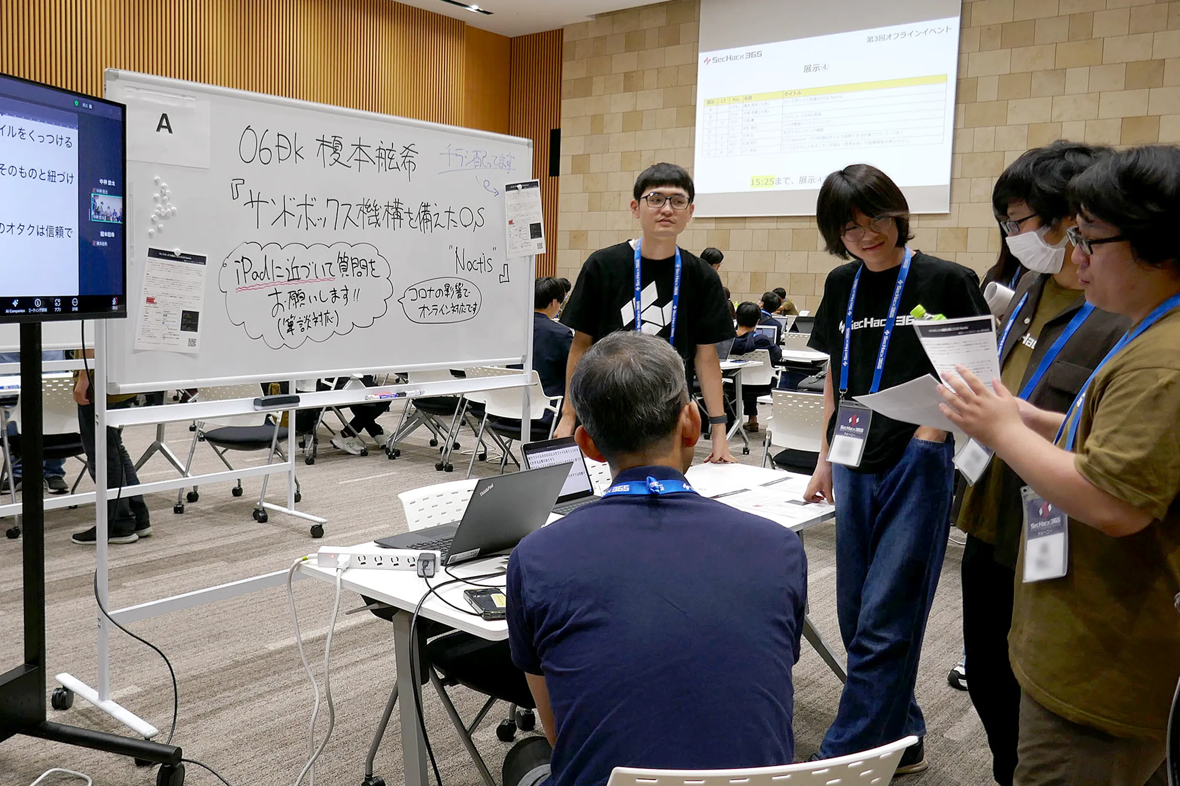 SecHack365の朝は早い――と言いたいところですが、トレーニーたちはギリギリまで展示に備えた準備やデモサイト・プログラムのバグ出しを行っていたようです。エレベーターの中では「半分しか動かないや、どうしよう」「半分も動くなんてすごいじゃん!」という会話も聞こえました。